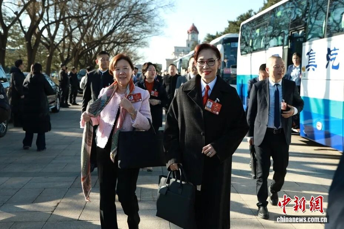 3月9日,十四届全国人大四次会议在北京人民大会堂举行第二次全体会议。图为全国人大代表邝美云(右)、朱叶玉如(左)步入会场。中新社记者 蒋启明 摄