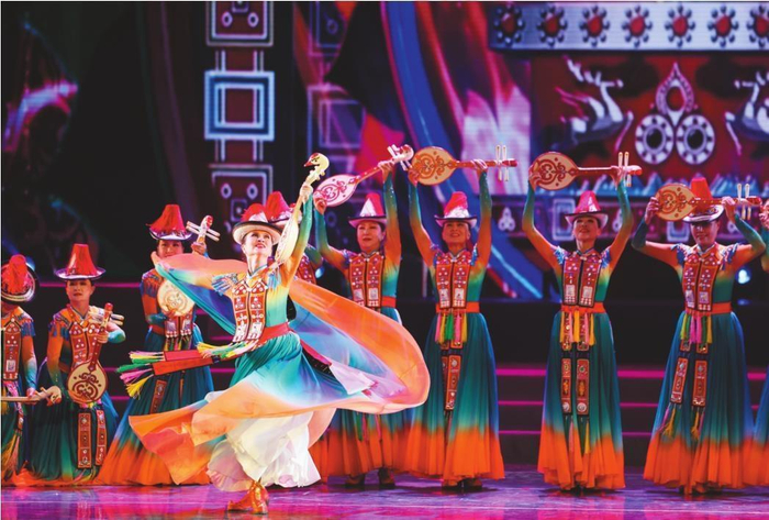 图:甘肃省张掖市裕固美舞蹈团的演员在甘肃省群众文艺展演展播活动首场演出中表演舞蹈。此次活动采用“线上+线下”“展演+展播”等形式为群众搭建家门口的文艺舞台,进一步激发基层文化活力。