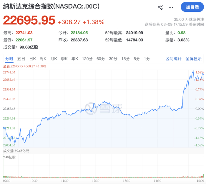 北京时间3月10日凌晨,美股三大指数尾盘直线猛拉,截至收盘,道指涨0.50%,标普500指数涨0.83%,纳指涨1.38%。当天盘初,道指一度大跌近2%,纳指、标普500指数一度跌超1%。
