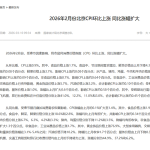 新京报讯 据国家统计局北京调查总队消息,2026年2月份,受春节因素影响,我市居民消费价格指数(CPI)环比上涨,同比涨幅扩大。