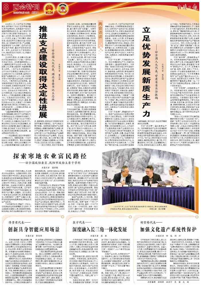 2024年11月,习近平总书记考察湖北,赋予湖北“在长江经济带高质量发展中奋勇争先,加快建成中部地区崛起的重要战略支点,奋力谱写中国式现代化湖北篇章”的使命定位。全国人大代表、湖北省委书记王忠林表示,1年多来,全省上下牢记嘱托、感恩奋进,坚定扛牢支点建设的重大政治责任,深入实施科创引领、产业倍增、枢纽提能等“七大战略”,经济运行呈现出稳中向好、量质并进的良好态势。去年,全省地区生产总值增长5.5%,增速居经济大省第二位,总量达到6.27万亿元。
