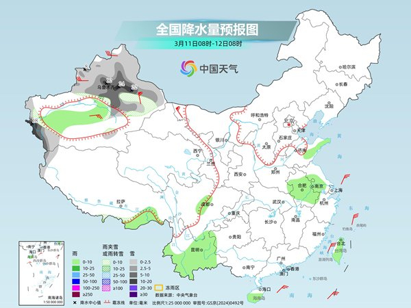 明天,新疆北疆和南疆西部山区等地部分地区有小到中雪或雨夹雪,其中,新疆沿天山地区和南疆西部山区等地部分地区有大到暴雪,局地大暴雪。新疆南疆盆地、西藏东南部、山东半岛、安徽大部、江苏南部、云南大部、海南岛中南部、台湾岛等地部分地区有小雨。