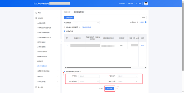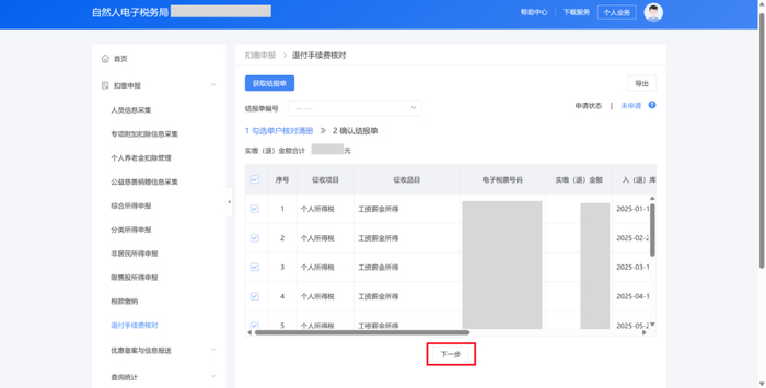步骤四:系统自动带出单户核对清册。核对单位2025年度扣缴税款信息,核对无误后,点击【下一步】。