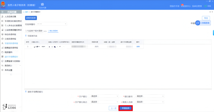 步骤四:查看并确认结报单,查看申请退付手续费金额,选择“开户银行”“银行账号”等信息,点击【申请退库】。