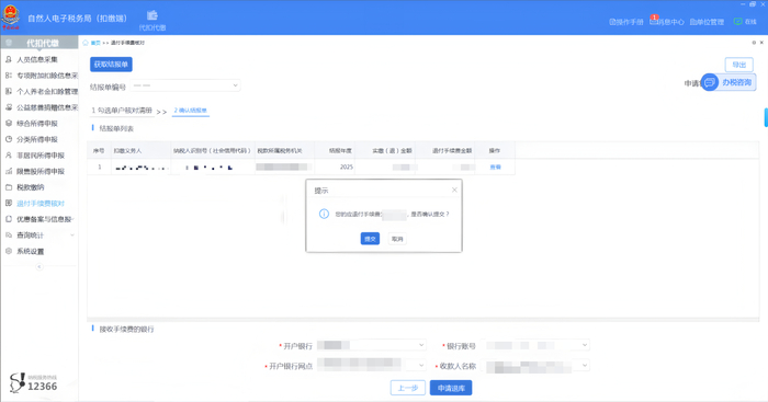 步骤五:系统弹出提示框,点击【提交】。完成后系统将推送至税务机关及国库审核,审核通过后,申请的手续费将退到扣缴义务人办理退付手续费时选择的银行账户内。