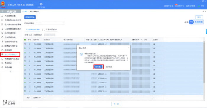 步骤二:点击左侧菜单“退付手续费核对”,进入“退付手续费核对”界面,系统自动弹出确认信息提示框,点击【我知道了】,系统自动带出单户核对清册。