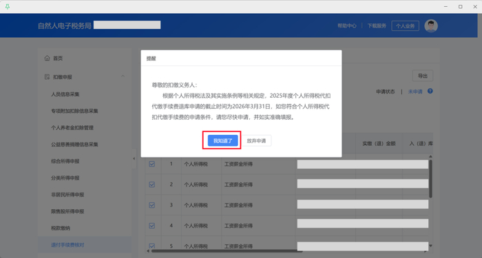 步骤三:在左侧“扣缴申报”模块下,点击【退付手续费核对】。系统弹出提醒信息,点击【我知道了】。
