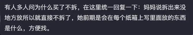 至于为什么买了不拆,视频发布者回复称:妈妈说拆出来没地方放,所以就直接不拆了,她前期是会在每个纸箱上写里面放的东西是什么,方便找。