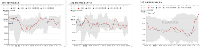 国内方面,已确认有多家炼厂降负荷;韩国方面,YNCC于3月3日宣布不可抗力,据市场传闻,LG,KPIC,GS Caltex和乐天的裂解装置均有不同程度降负荷;日本方面,重整开工已经环比下降4.1%至82.7%。