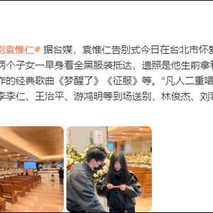 据媒体相关报道,袁惟仁告别式今日在台北市怀爱馆景行楼至忠三厅举行,他的两个子女一早身着全黑服装抵达。