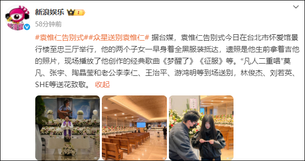 袁惟仁告别式举行,丧葬费均由音乐圈好友为其支付!林俊杰、S.H.E、刘若英等送别,现场播放其经典歌曲《梦醒了》《征服》