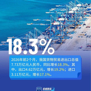 海关总署3月10日发布数据显示,2026年前2个月,我国货物贸易进出口总值7.73万亿元人民币,同比增长18.3%。其中,出口、进口均实现较快增长,民营企业活力凸显,对东盟、欧盟及共建“一带一路”国家贸易保持强劲增长,外贸延续稳中有进态势,韧性和活力进一步彰显。