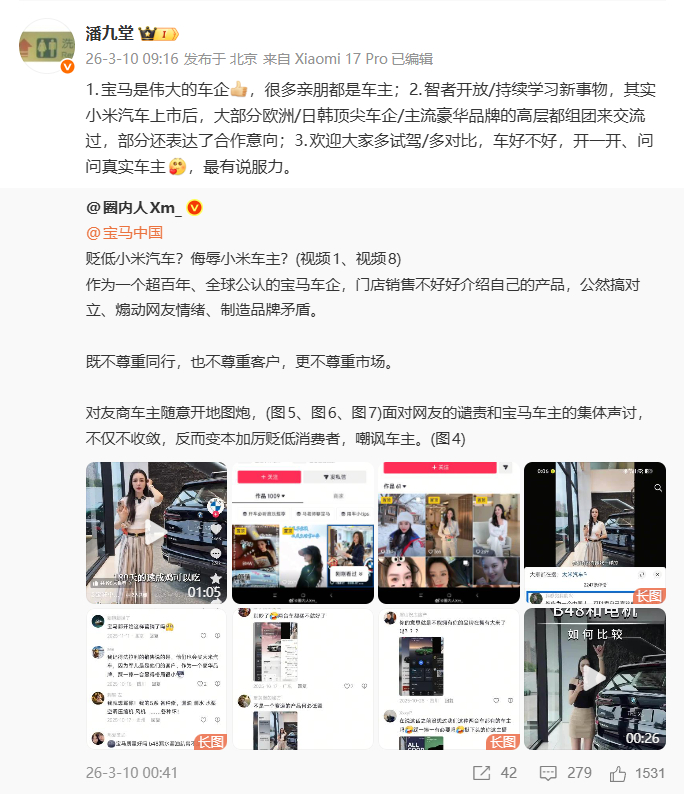 近日,有博主爆料一宝马门店销售在直播中疑似贬低小米汽车、侮辱小米车主。