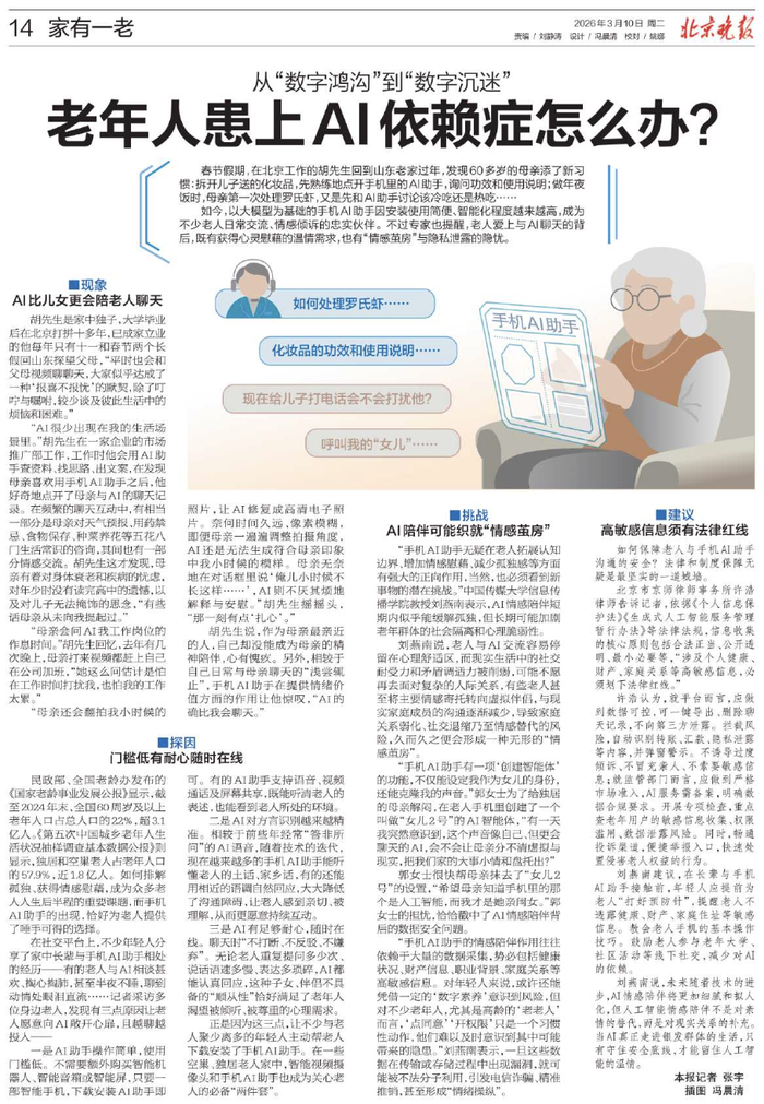 “手机AI助手无疑在老人拓展认知边界、增加情感慰藉、减少孤独感等方面有强大的正向作用,当然,也必须看到新事物的潜在挑战。”中国传媒大学信息传播学院教授刘燕南表示,AI情感陪伴短期内似乎能缓解孤独,但长期可能加剧老年群体的社会隔离和心理脆弱性。