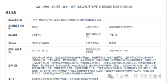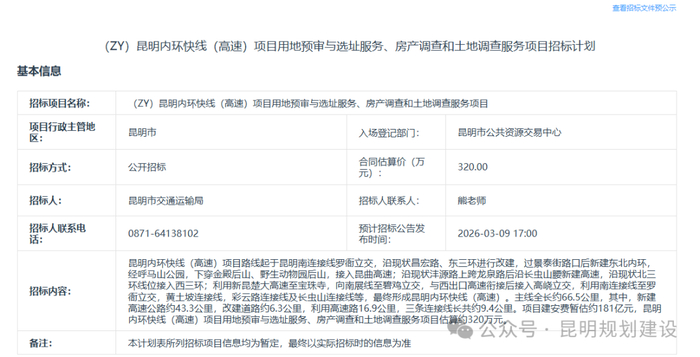 近日,昆明市交通运输局发布《昆明内环快线(高速)项目用地预审与选址服务、房产调查和土地调查服务项目》《昆明内环快线(高速)项目技术及经济可行性方案编制服务项目》招标计划。
