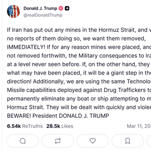 “如果伊朗在霍尔木兹海峡布设了任何水雷——尽管我们尚未收到相关报告——我们要求他们立即清除!”特朗普写道。