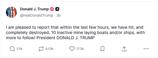 特朗普随后不久又发布了一则帖子,称美军已 “彻底摧毁” 10 艘处于非活跃状态的伊朗布雷船,后续还将有更多行动。
