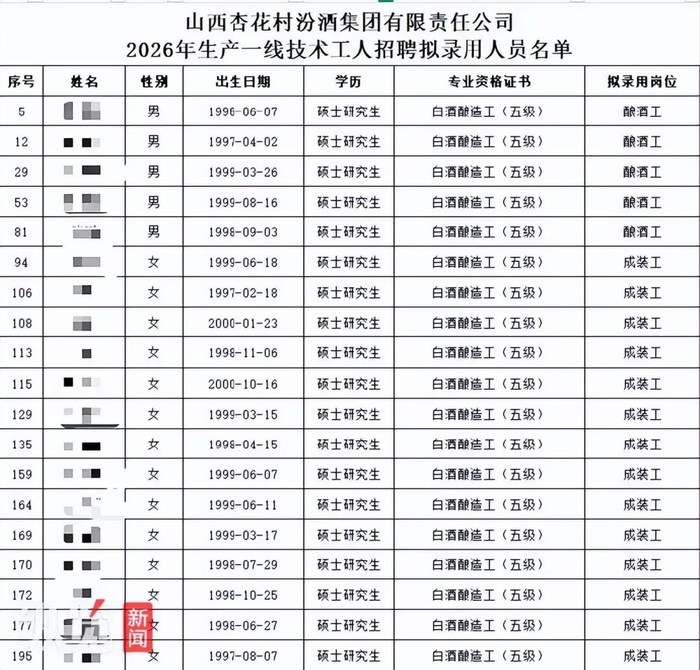 近日,山西杏花村汾酒集团有限责任公司(以下简称汾酒集团)公示了2026年生产一线技术工人招聘拟录用人员名单。名单中,酿酒工和成装工岗位拟录用人员中出现了10多名硕士研究生,引发关注。“用铁锹摊晾、撒曲需要这么高的学历吗?”有网友提出了疑问。