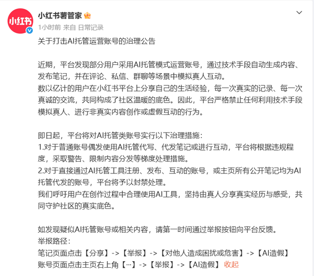 近期,平台发现部分用户采用AI托管模式运营账号,通过技术手段自动生成内容、发布笔记,并在评论、私信、群聊等场景中模拟真人互动。