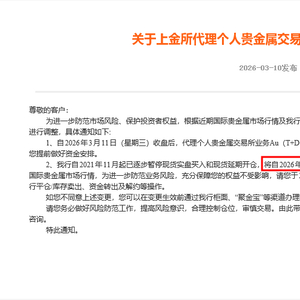 邮储银行今年2月11日公告,即日起至2026年3月13日0时,将停止代理上海黄金交易所个人贵金属业务。