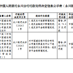 3月11日金融一线消息,中国人民银行永川分行行政处罚决定信息公示表显示,中国建设银行股份有限公司重庆荣昌支行违反支付结算管理规定;违反金融统计管理规定;违反货币金银管理规定,受到警告,并处74.6万元罚款。