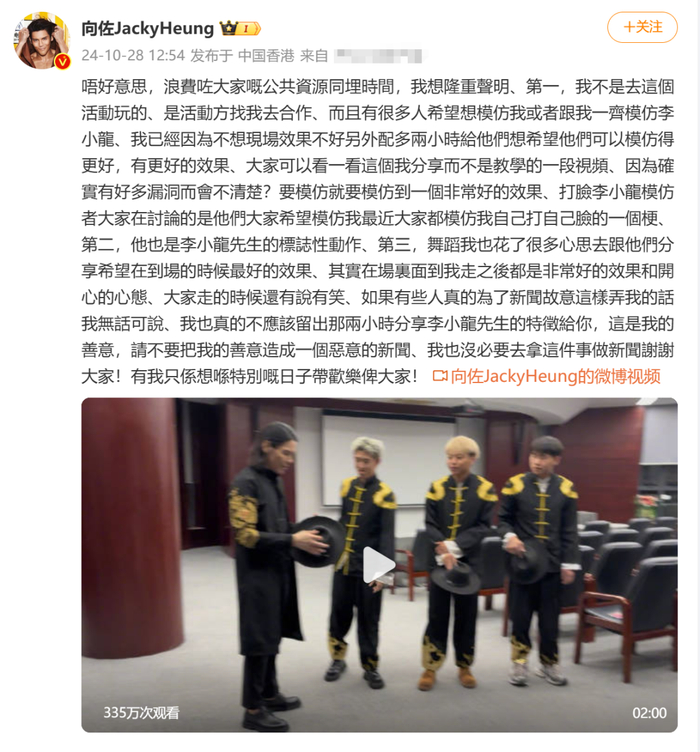 向佐发微博回应此事,称自己是受活动方邀请参加的活动,因为很多人希望模仿“向佐”或者一起模仿李小龙,自己还延长了2个小时的活动时间。打脸李小龙模仿者是大家希望其模仿自己打自己的一个梗,舞蹈自己花了很多心思,大家走的时候还有说有笑,如果有些人为了新闻故意这样弄他,也无话可说。