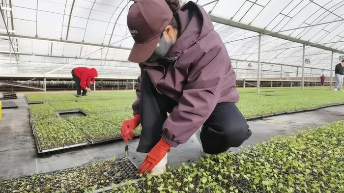 在小坝镇林皋村的绿蔬园蔬菜育苗专业合作社温室大棚里,工人们在分工协作开展点种、覆土等育苗作业。作为春耕生产的关键一环,合作社积极采用现代化智能育苗技术,通过精准调控温室内的温度、湿度与光照,全面提升育苗质量和效率。温室大棚育苗在满足种植需求的同时,还吸引了不少林皋村本村及周边村民前来务工,在家门口实现就业,增加收入,共同致富。林皋村村民董来花说:“我是正月初九来这上的班,离家近,一天100块钱管一顿饭,给家里增一份收入。”