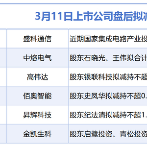 3月11日增减持汇总:盛科通信等6股披露拟减持,当日无A股增持(表) 新浪证券 新浪证券官方账号 03.1121:54 关注 据统计,3月11日,盘后盛科通信、中熔电气、高伟达、佰奥智能、昇辉科技、金凯生科6股披露拟减持情况,当日暂无A股公司披露增持情况。