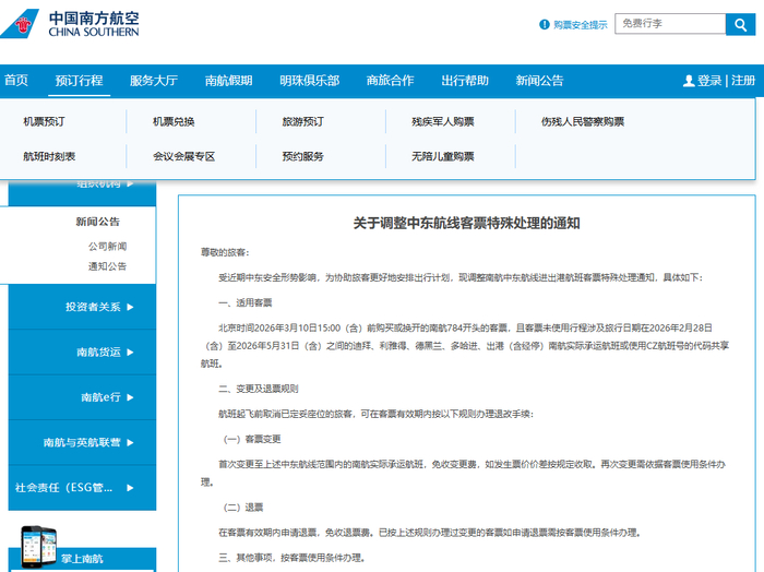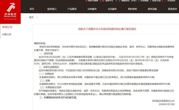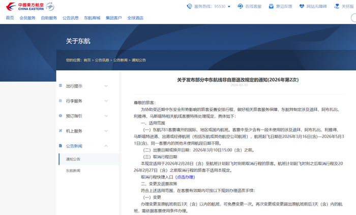 对于客票未使用行程涉及旅行日期为2026年2月28日(含)至2026年5月31日之间、购买或换开日期在2026年3月10日15时(含)前且符合条件的相关航线客票,在客票有效期内,可至原购票渠道办理未使用航段非自愿变更或退票,退票和首次变更免收手续费。旅客可以通过航空公司官方渠道了解详细退改签政策和办理退改签手续。