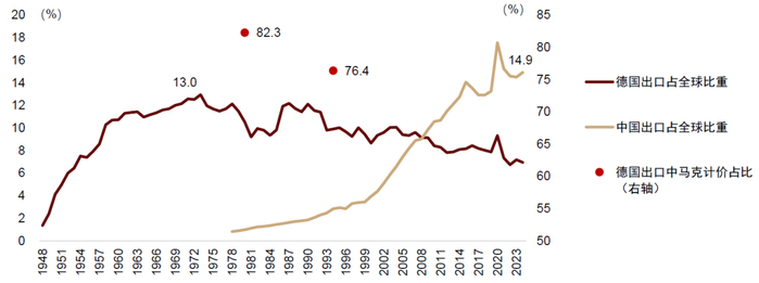从历史来看,制造业的领先地位、产业链的发达一定程度上可以传导到货币的国际定价权上,德国便是一成功案例。1948至1960年代被称为德国的“经济奇迹”(Wirtschaftswunder)。二战结束时,德国经济遭受重创,工业设施毁坏,通胀高企,货币体系崩溃。1947年美国推出马歇尔计划,为欧洲复兴提供资金支持。1948年,西德采用新货币德意志马克取代已经崩溃的旧马克,并开始逐步取消配给制和价格限制,推行自由化市场化竞争。在内部改革和外部援助的合力下,20世纪50年代德国经济快速崛起,10年间GDP年均增长约8%,出口总额占全球比重从1948年的1.4%提升至1960年的10.7%。制造业是德国这一时期经济腾飞的核心驱动力,包括钢铁、化工、机械、汽车等领域。随之而来的,德国马克的国际地位也大幅提升:1979年欧洲货币体系建立,德国马克成为事实上的“锚货币”(anchor currency),以规则化体系化的形式确立了德国马克在欧洲的主导地位;到1980年,德国出口总额中约82.3%以德国马克计价(Tavlas, 1997)。