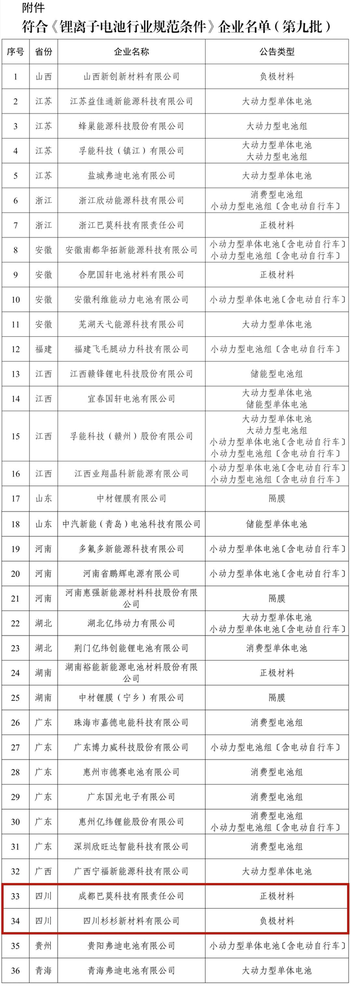 近日,工业和信息化部公布第九批符合《锂离子电池行业规范条件》企业名单,共36家企业上榜。其中,四川2家企业榜上有名⬇️