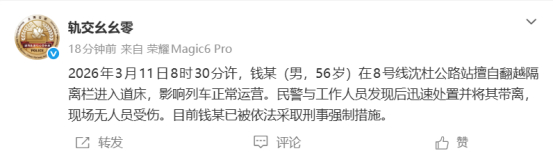 一男子擅自翻越地铁隔离栏影响运营,上海轨交警方:男子已被采取刑事强制措施。