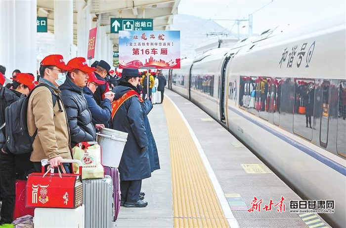 春节后的首个工作日,来自定西市的500余名务工人员,搭乘G2096次高铁务工专列前往山东省青岛市。这是甘肃省春节后开行的首趟返岗务工专列,也是定西市连续第七年开通免费返岗务工高铁专列。与此同时,兰州新区2026年“春风行动”首场万人招聘会火热进行,340多家企业提供1.1万个就业岗位,其中新材料、现代化工、装备制造等主导产业岗位占比超六成,成为吸纳就业的主力军。