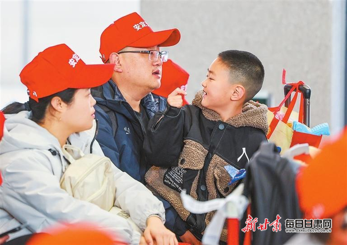 务工人员赵和壁(中)与家人在定西北站候车。