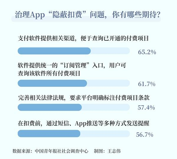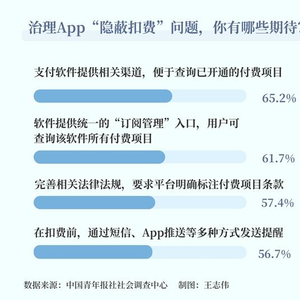 治理App“隐蔽扣费”问题,大家有哪些期待?65.2%的受访者希望支付软件提供相关渠道,便于查询已开通的付费项目,61.7%的受访者希望软件提供统一的“订阅管理”入口,用户可查询该软件所有付费项目,57.4%的受访者希望完善相关法律法规,要求平台明确标注付费项目条款。