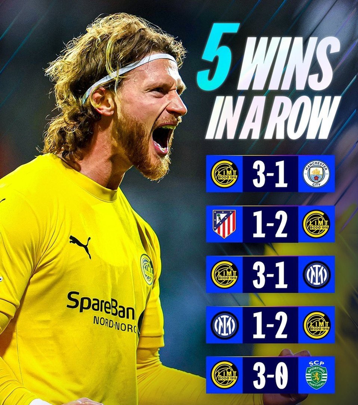 在剩余的一场欧冠比赛中,本赛季的大黑马挪超霸主博德闪耀主场3比0拿下葡萄牙体育,豪取欧冠5连胜。