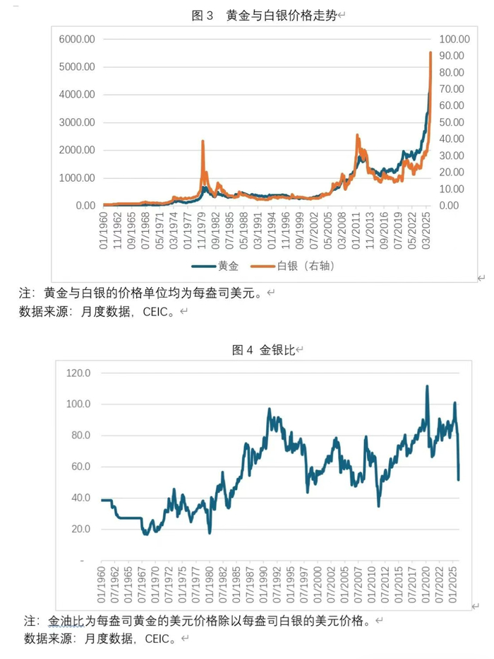 图3展示了1960年1月至2026年2月全球黄金价格与白银价格走势,图4展示了同一时期金银比变化。从图3可以看出:第一,历史上白银价格走势与黄金价格走势高度正相关;第二,在金银价格的几个周期性高点,白银价格涨跌幅度均显著超过黄金;第三,在价格触顶后,白银价格会先于黄金价格回落。从图4可看出,金银比整体上呈现出随着时间推移而上升的趋势。例如,金银比在上世纪60年代、70年代、80年代、90年代,本世纪00年代、10年代的均值分别为28.3、31.6、52.7、73.7、61.5与67.5倍。2020年至2025年,金银比均值为83.3倍。