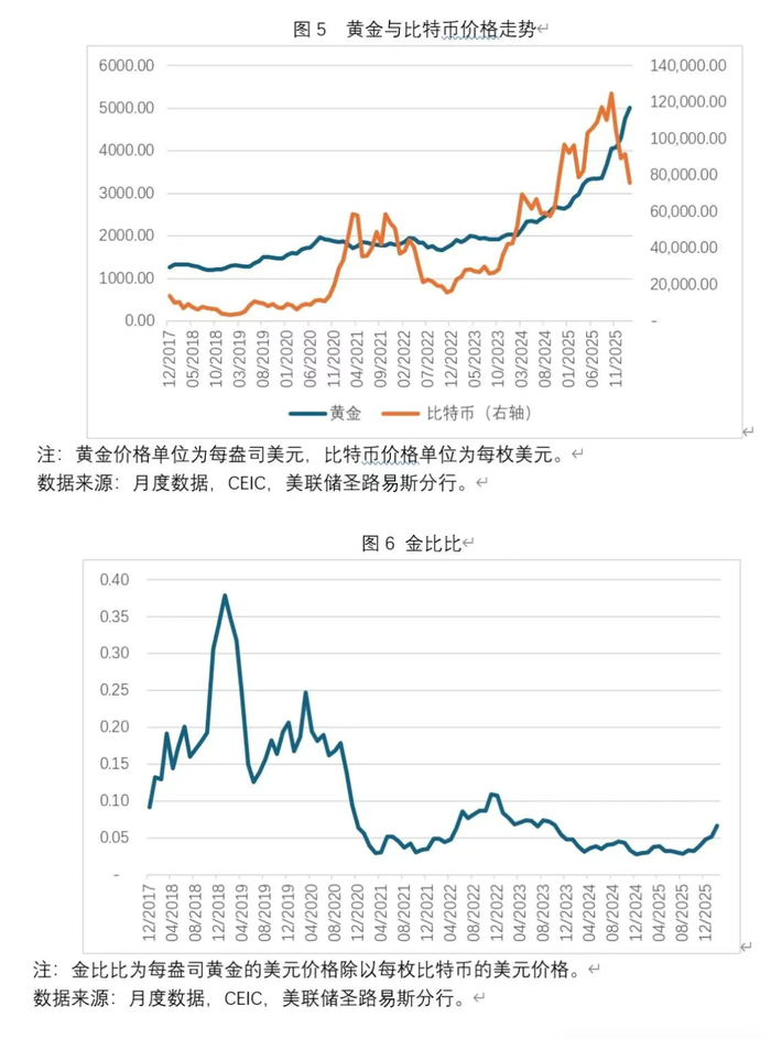 图5展示了2017年12月至2026年2月全球黄金价格与比特币价格走势,图6展示了同一时期金比比的变化。不难看出,比特币的价格波动性显著高于黄金。自比特币价格在2025年10月创下每枚12.47万美元的历史性高位后,比特币价格与黄金价格走势就呈现显著的负相关。2021年至今,金比比大致在0.03~0.11的区间内波动。2021年1月至2026年2月,金比比的月度均值为0.05。