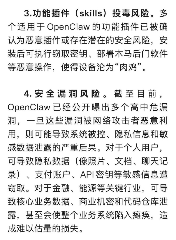建议相关单位和个人用户在部署和应用“龙虾”时,强化网络控制,关闭不必要的公网访问;加强凭证管理,避免在环境变量中明文存储密钥;严格管理插件来源,禁用自动更新功能;并持续关注官方安全公告和加固建议,防范潜在网络安全风险。