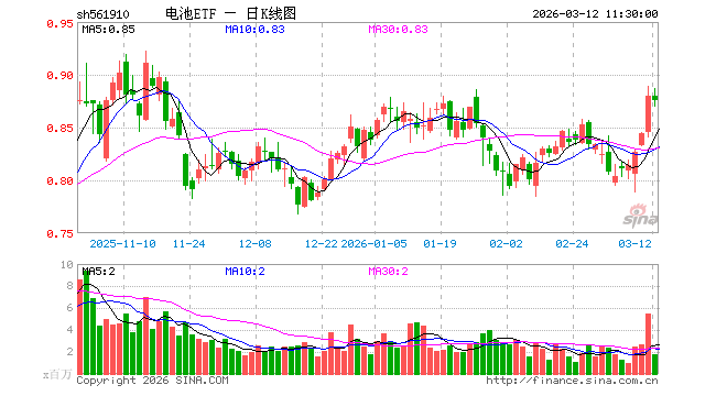 3月12日,截止午间收盘,电池ETF(561910)跌0.57%,报0.875元,成交额1.59亿元。电池ETF(561910)重仓股方面,阳光电源截止午盘跌0.36%,宁德时代跌0.69%,三花智控跌0.66%,亿纬锂能涨0.22%,天赐材料跌1.76%,先导智能跌1.13%,格林美跌2.86%,国轩高科跌0.95%,多氟多跌1.73%,欣旺达涨1.16%。
