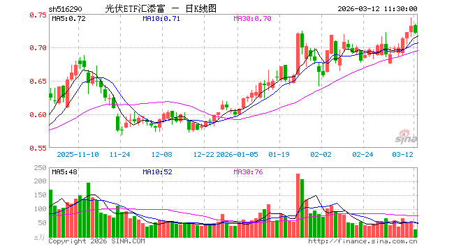 3月12日,截止午间收盘,光伏ETF汇添富(516290)跌1.50%,报0.721元,成交额1935.68万元。光伏ETF汇添富(516290)重仓股方面,特变电工截止午盘跌2.03%,隆基绿能跌1.44%,阳光电源跌0.36%,TCL科技跌1.23%,通威股份跌2.36%,迈为股份跌4.95%,德业股份涨3.75%,正泰电器跌0.80%,TCL中环跌2.06%,捷佳伟创跌3.41%。