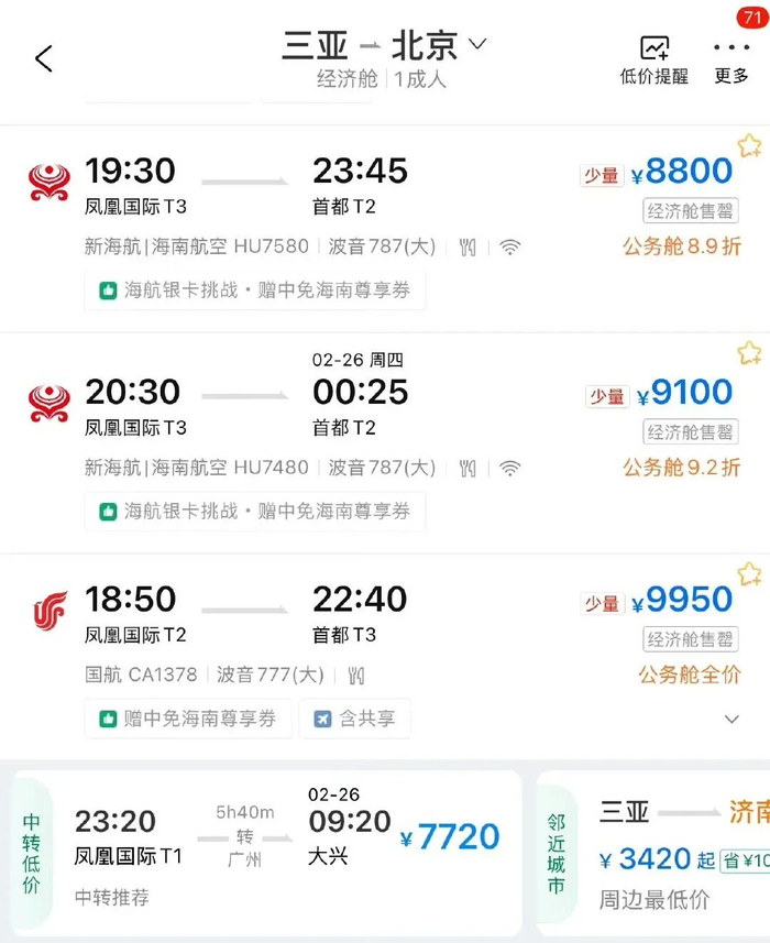 初六、初七正值返程最高峰,三亚飞北京、上海的直飞经济舱直接售罄,剩下的公务舱逼近万元;飞成都标价9980元,差20块就破万;飞广州、深圳,就算中转也要7000往上。更离谱的是,一家五口从三亚返回乌鲁木齐,机票要花快十万。