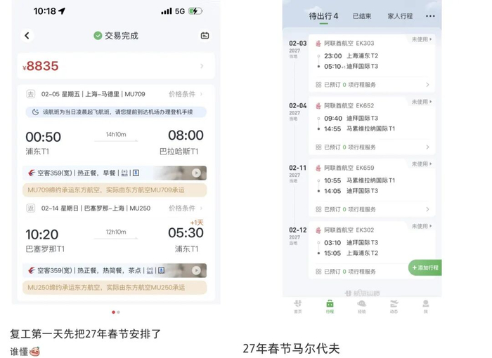 有网友花费4879元锁定了2027年春节北京到西班牙机票;有人提前下手北京-斯里兰卡往返机票;有人花5400拿下2027年春节西葡往返机票。