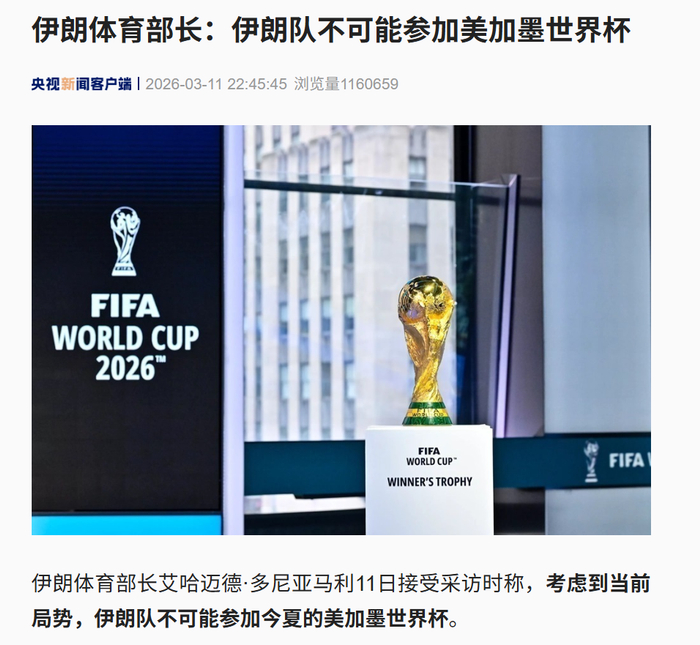 2月28日,美国和以色列对伊朗发动军事打击。伊朗足协主席迈赫迪·塔吉3月1日表示:“我们不能对参加世界杯抱有期待。”