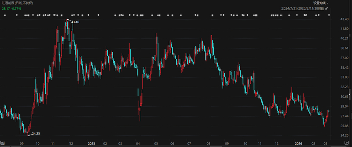 2025年一整年,该公司股价波动下行,年底较年初累跌近14%,较2024年12月初变更实控人时股价峰值(43.28元/股)跌近三成。2026年以来,汇通能源股价仍在下探,到3月11日累跌超6%。