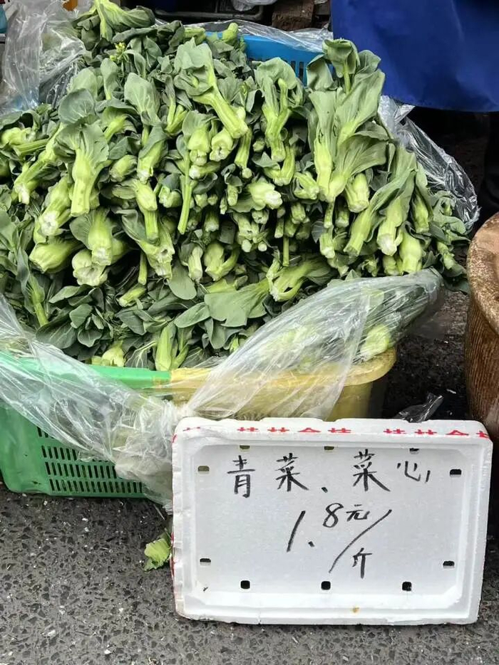 还有杭州人心中的白月光——菜心,价格便宜的也只要1元多一斤。菜心也叫菜薹,清炒鲜甜可口,烧年糕更是提鲜增香。在杭州,它和春笋、荠菜、香椿并称春日“四鲜”。
