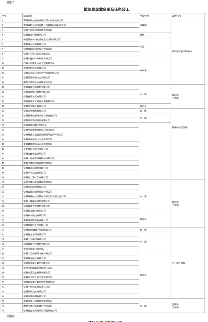 全区电解铝、钢铁、水泥(含水泥粉磨站)、铁合金企业77家,具体名单详见附件1。