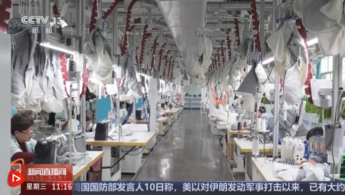 山东威海一家服装企业的生产车间内一片繁忙的生产景象,正在吊挂和流转的是一些半成品衣物。它所依靠的就是智能吊挂系统,系统会按照工序自动地把这些衣物流转到每一个对应的工位处。在每一个工位的面前都会有一块智能面板,上面体现着工序、工艺规程和产量等信息。每个工人所负责的工艺步骤都是不相同的,系统会提前预估工作量,并且精准地分配工作任务。