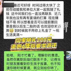 女子结婚时同事随份子钱200元,对方离职4年半后发信息要求返还礼金,当事人:对方措辞实在“奇葩”