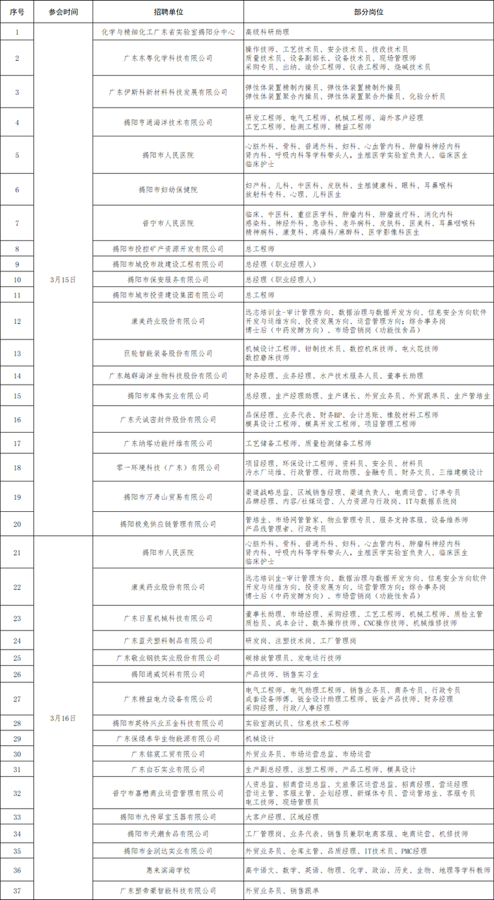 揭阳招聘单位及部分岗位一览表